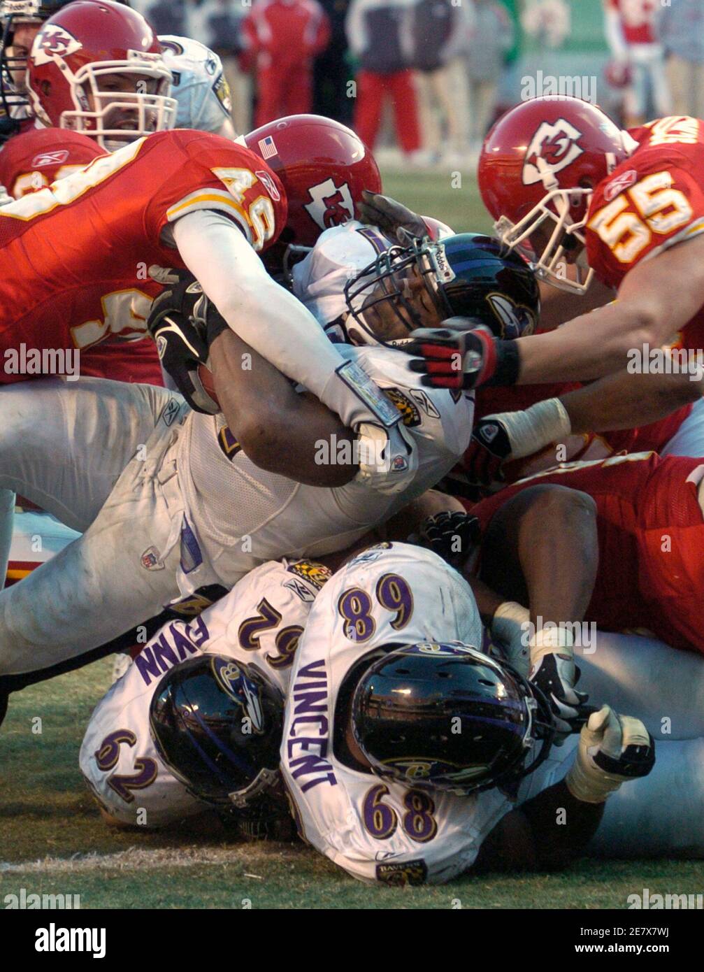 Baltimore Ravens Running Back Jamal Lewis C Muscles Past The Kansas City Chiefs Defense To Score A Fourth Quarter Touchdown On A One Yard Run During Their Nfl Football Game At Arrowhead Stadium